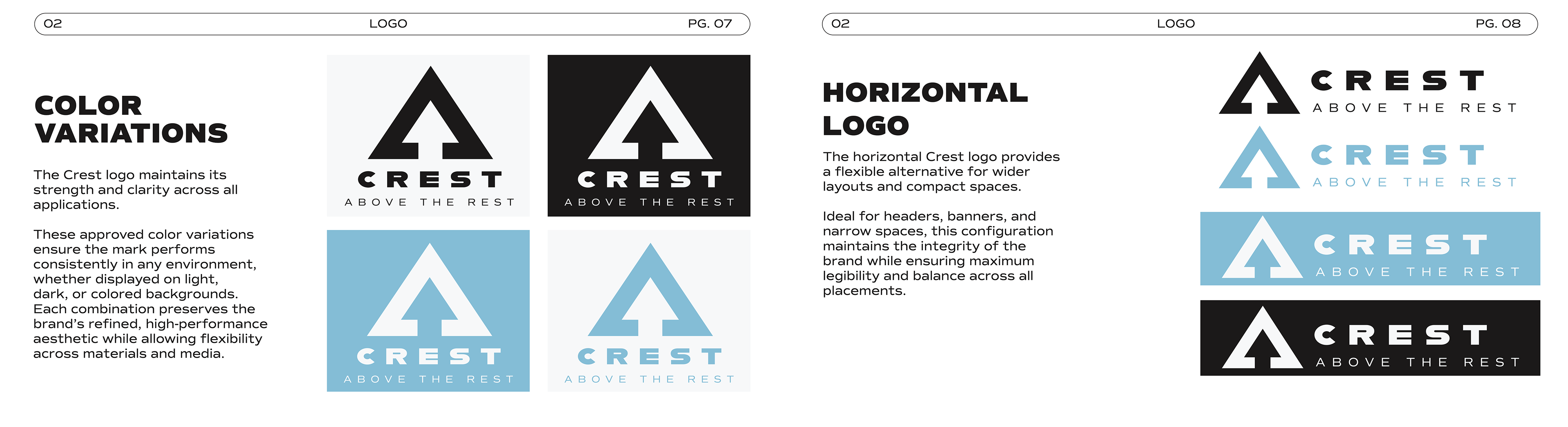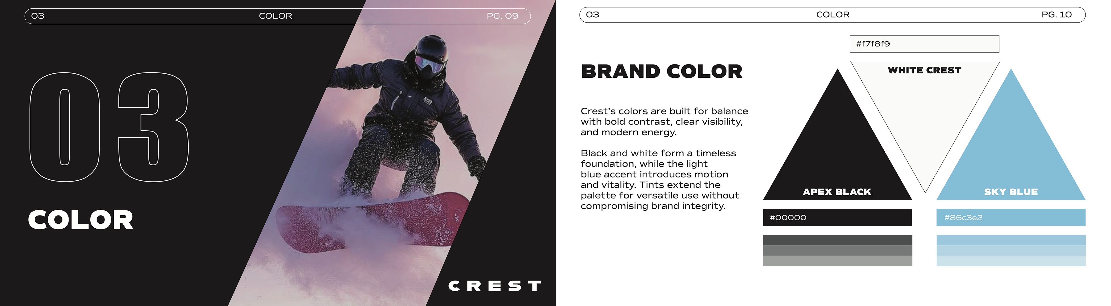 A brand guideline booklet created for Crest, a high- end ski brand created for the experienced skier The goal was to combine the modern sport aesthetic with a luxury feel.