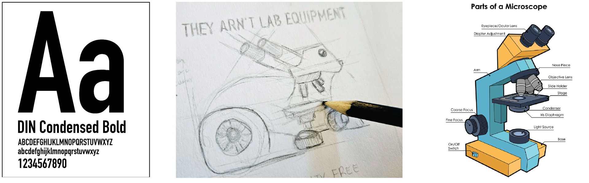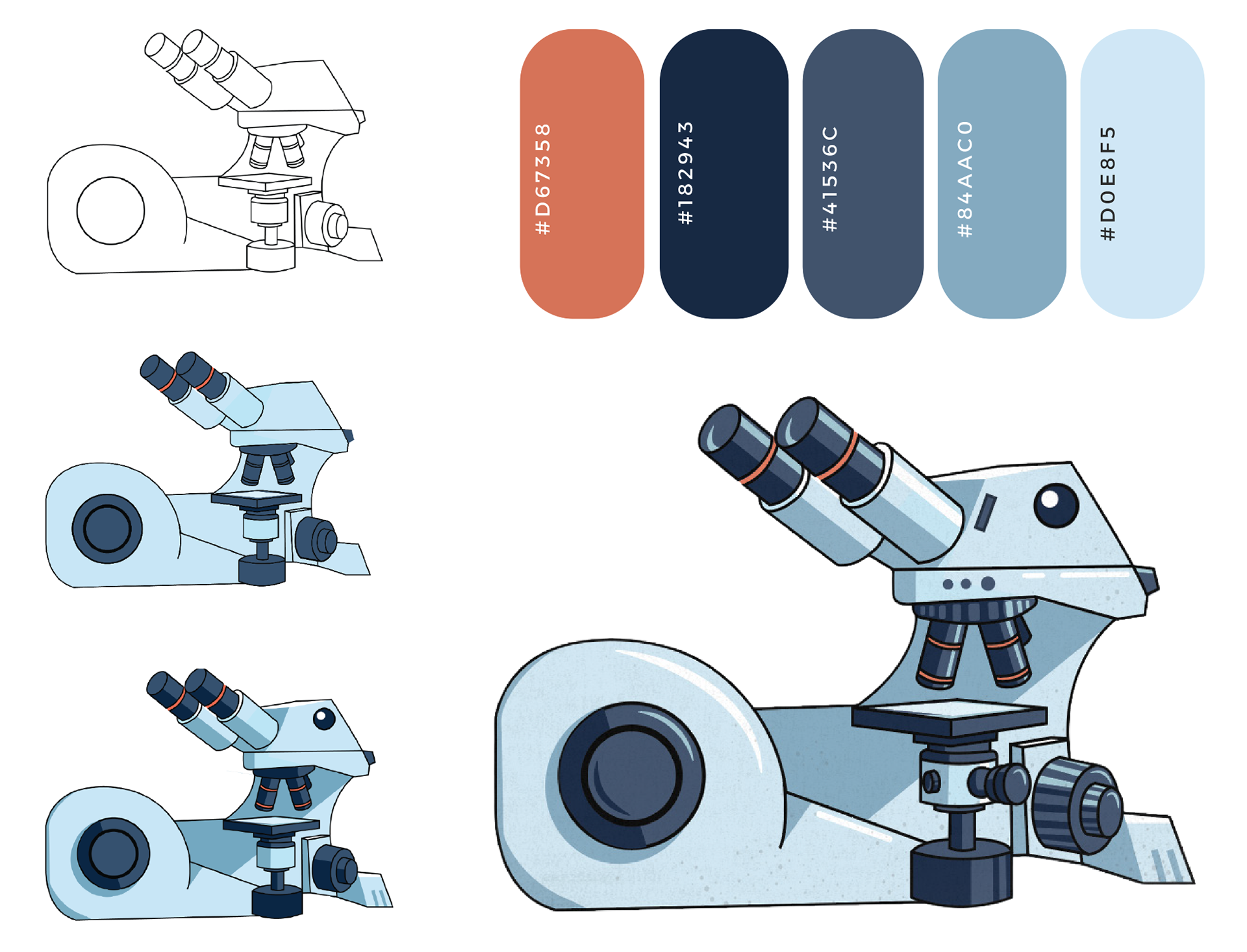 In the sketches, I focused on picking the most recognizable features of both the animals and the equipment (e.g., bunny ears with microscope lenses). I added a simple color palette and minimal shading inspired by medical infographics to keep the visuals clean, approachable, and easy to read."